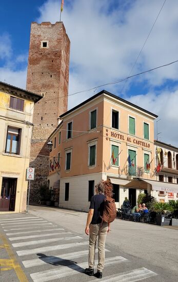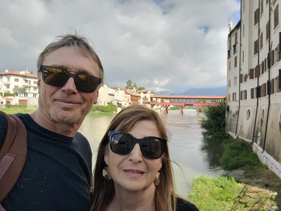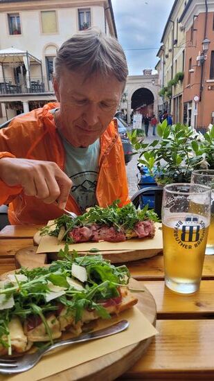 Nach halb drei erreichten wir Bassano del Grappa. Direkt vor der Ponte Veccio bei einer Birreria stellten wir das Bike ab und es fing an zu nieseln. Wir stärkten uns mit Buscetta und Bier und buchten ein Hotel für 2 Nächte bei booking.com. Ein Fehlgriff!!! Das unpersönliche Glamour Hotel ****s befand sich in einer Industriezone und hatte eigentlich nichts zu bieten außer einem schlechtem Restaurant.