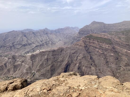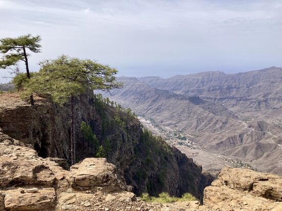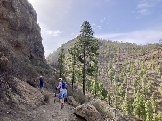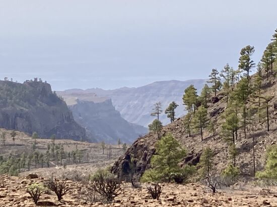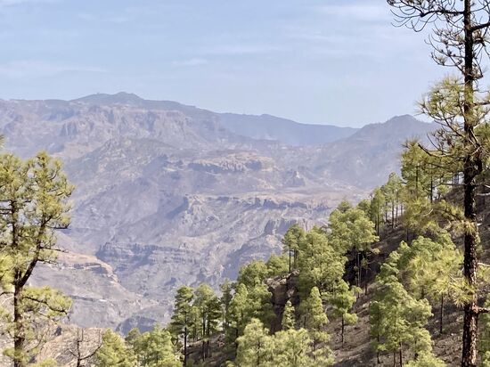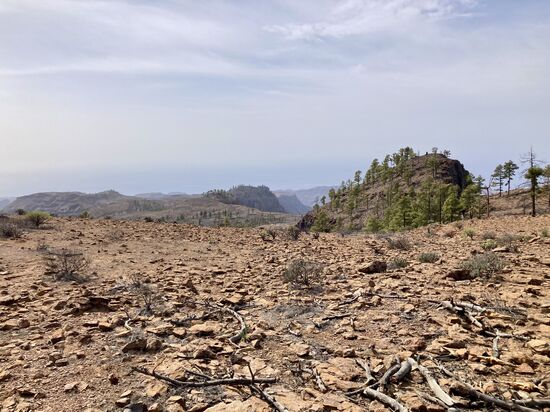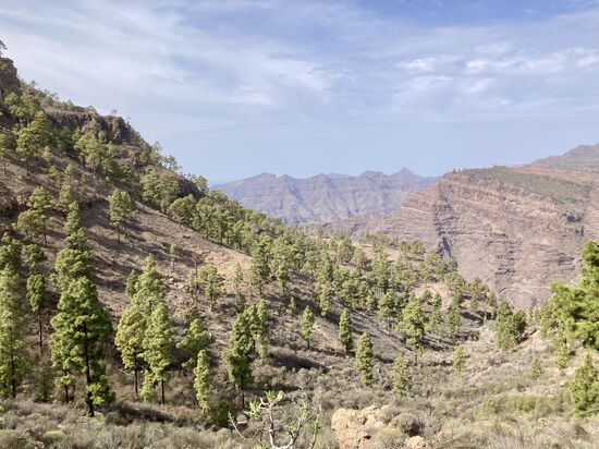 Wir beginnen die Wanderung am Stausee Presa del Salto del Perro in einer Höhe von etwa 900 Metern ü. NN. Der Weg führt auf einer Länge von 3 Kilometern hoch zum Gipfel auf über 1200 Metern. Auf der Strecke und oben vom Gipfel erleben wir tolle Ausblicke in die Barrancos von Arguineguin, Andrés und von Mogán. In der Ferne sehen wir den Strand Playa del Inglés mit den Dünen von Maspalomas, den Roque Nublo und den Pico de las Nieves. Leider ist die Aussicht durch Calima begrenzt. Der heiße Wind aus der Sahara trägt heute wieder viel feinen Staub, welcher die Luft trübt. Auch die Temperatur ist deutlich höher als für diese Jahreszeit üblich. Den Teide von Teneriffa sehen wir heute also nicht.