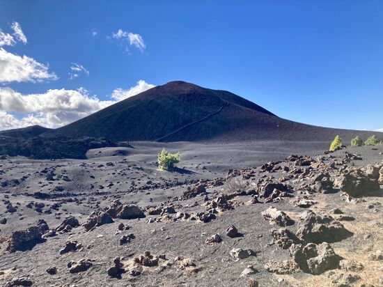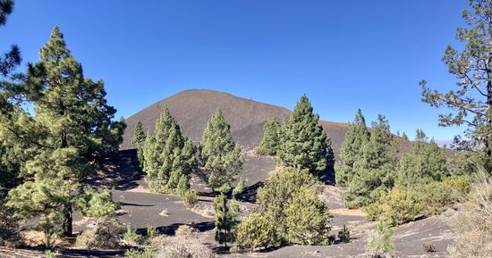Morgens kommt der besagte Ranger. Er will uns nicht nachmelden, so machen wir uns auf zu einem Wanderparkplatz. Dort bereiten wir uns erst mal Frühstück. Anschließend eine kleine Wanderung um den Vulkan Cinyero. Die Wanderung ist als Rundweg von 2,4 km beschrieben. Dass wir unser Trinkwasser im Auto vergessen haben, stört uns nicht. Ist ja eher ein Morgenspaziergang. Nach 2,4 km sind wir jedoch nicht zurück, sondern am Beginn der Rundwanderung um den Vulkankegel. So wird aus dem Morgenspaziergang ein 11 km langer Marsch mit 310 Höhenmetern - ohne Wasser. Trotzdem, der Weg ist toll und die Aussichten sehr eindrucksvoll.