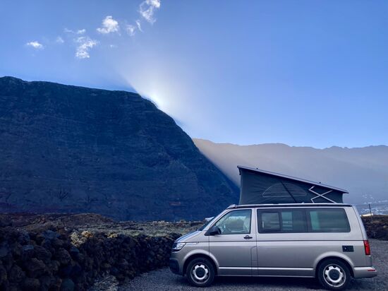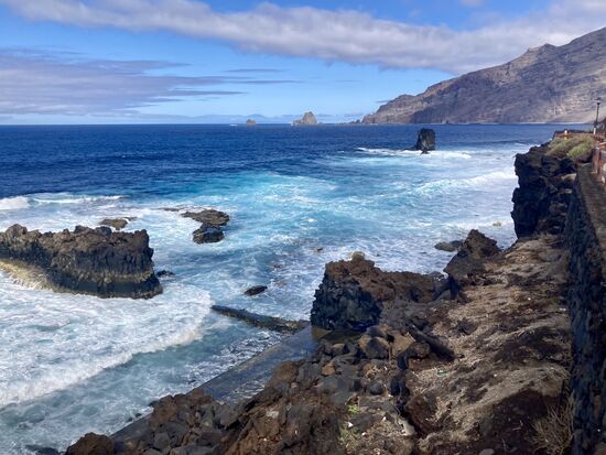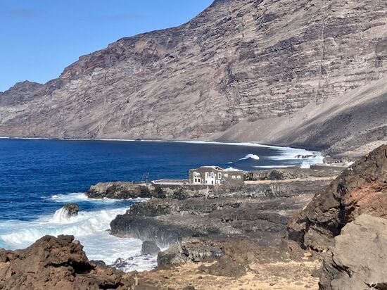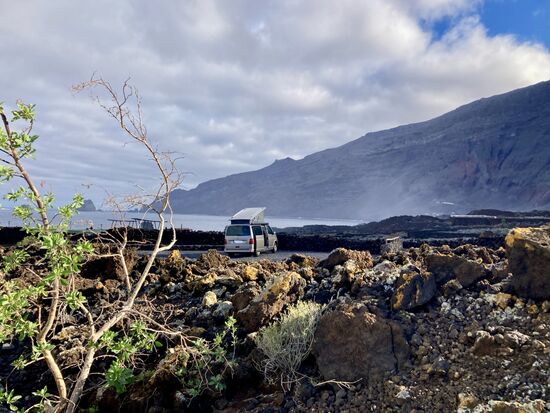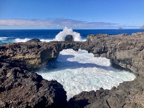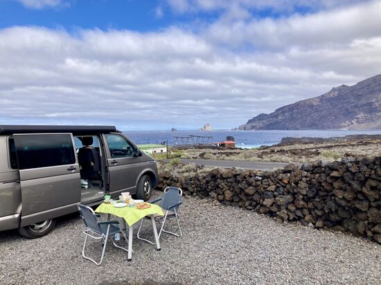 In Valverde, der Hauptstadt dieser Insel, suchen wir einen Supermarkt. Die Auswahl an Geschäften ist nicht groß, auch nicht die Auswahl an Produkten. Egal, wir kaufen Gemüse und weiter geht’s in Richtung Las Puntas an der Küste im Nord-Westen von El Hierro. In dieser Gegend gibt’s den einzigen ausgewiesenen Stellplatz für Wohnmobile. Er ist wirklich schön angelegt, kostenlos und in Hörweite der tosenden Brandung. Genau wie wir es lieben. Hier bleiben wir für 2 Nächte, um uns von dem „Stress“ der letzten Tage zu erholen