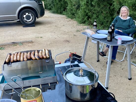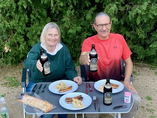 Zum Abendessen habe ich etwas Besonderes vorbereitet. Noch in Deutschland hat mir unser Metzgermeister eine spezielle Variante der fränkischen Bratwurst angefertigt. Sie ist ohne Gefrierfach, unter den normalen Bedingungen eines Kühlschranks, 2-3 Wochen haltbar. Dazu genehmigen wir uns eigens dafür mitgebrachtes fränkisches Bier aus Buttenheim.