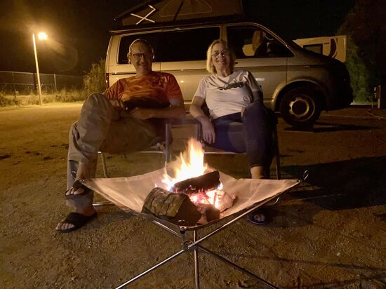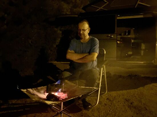 Nach dem Grillen genießen wir die warme Nacht. Am Lagerfeuer lassen wir den Tag ausklingen. Um keine hässlichen Rußflecken am Boden zu hinterlassen verwenden wir ein Edelstahlnetz auf 4 verschränkten Füßen.