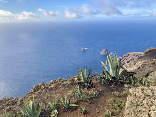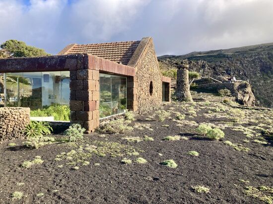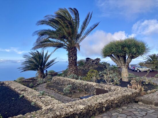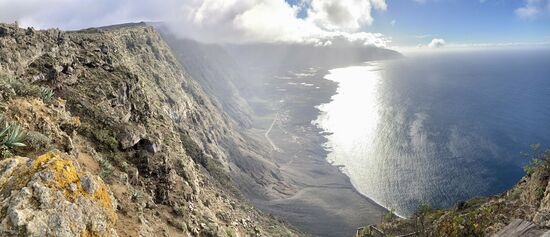 Nach der Wanderung beim Arco de la Tosca besuchen wir noch den Mirador La Peña. Die Aussicht dort auf El Golfo ist beeindruckend. El Golfo ist ein riesengroßes, vulkanisches Einsturzgelände. Auf der einen Seite mit mehreren hundert Meter hohen Steilwänden, auf der anderen Seite zum Meer hin geöffnet.