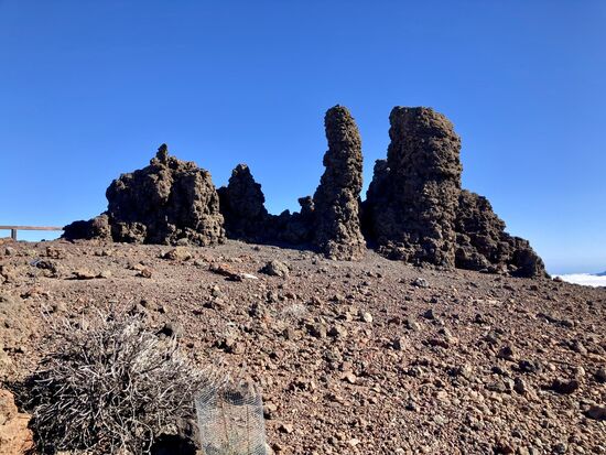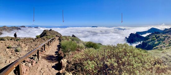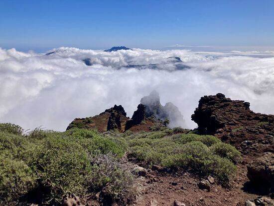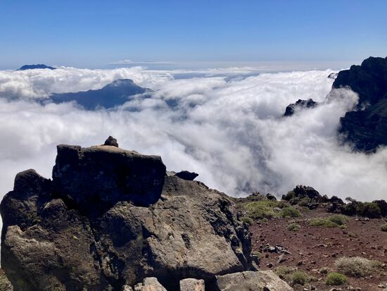 Die Wolken liegen heute unterhalb des Roque de los Muchachos. Sie verwehren uns den Ausblick in die Caldera. Trotzdem sind die Eindrücke, die sich uns bieten intensiv und in der Ferne sehen wir die Inseln Teneriffa, La Gomera und El Hiero.