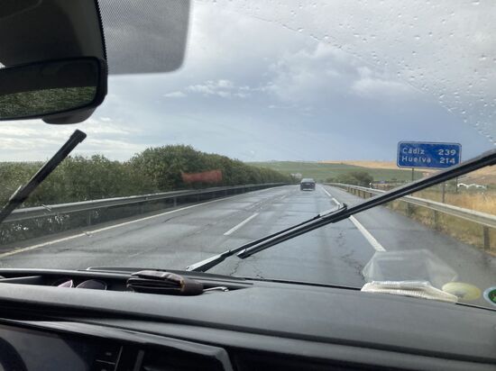 So entscheiden wir uns nach Huelva an die Atlantikküste zu fahren. vielleicht können wir unsere Fährpassage um eine Woche vorverlegen. Auf der Fahrt wechseln Regen und Sonne.