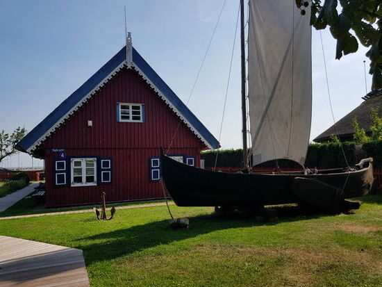 Vor einem Museum ist ein traditioneller Kurenkahn zu sehen.