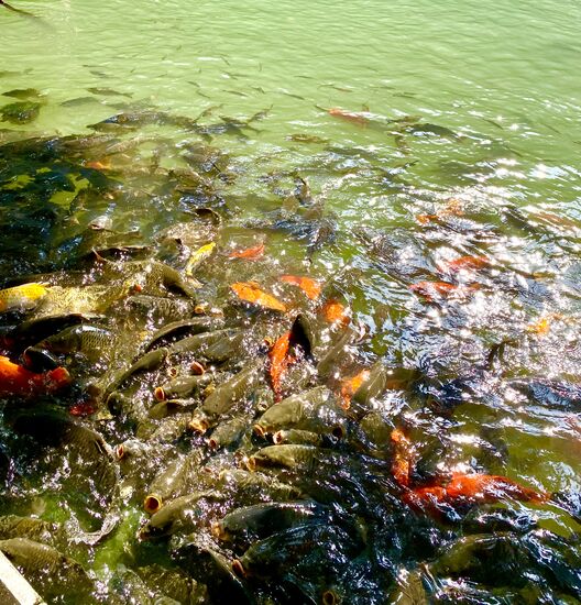 Offensichtlich kennen die Fische das und erhoffen sich einen kleinen Snack. Zu Hunderten wimmelt es am Ufer.