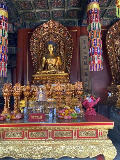 Der Lama Tempel ist ca 30 Minuten von unserem Hotel entfernt. Bei klarem Himmel, Sonnenschein steigen wir aus und sind beeindruckt von der unglaublichen Ruhe hier. Der Lama Tempel ist mitten in der Stadt ,umgeben von einer Schnellstraße und einem unglaublichen Gewusel. Und hier hört man ‚NICHTS‘ ausser das wunderschöne Gezwitscher der vielen Vögel, die zwischen den unzähligen schönen Bäumen umherflattern und singen.