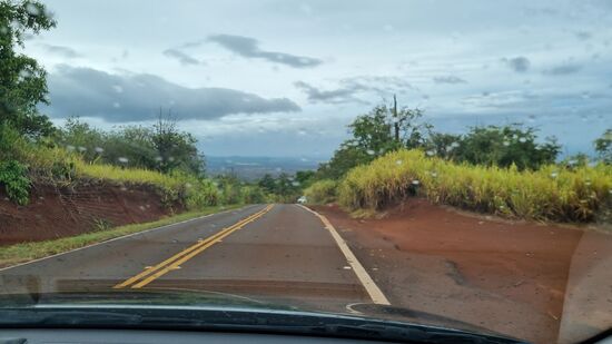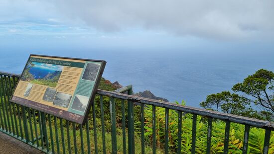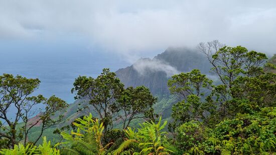 Wir fahren noch zum letzten Aussichtspunkt, dem Kalalau Lookout. Dort sehen wir in den dichten Regenwolken fast gar nichts mehr.