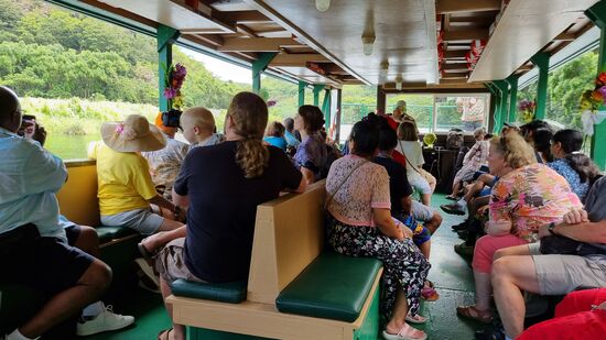 Um kurz nach 2 Uhr fahren wir dann schließlich mit dem Ausflugsboot auf dem Waimea River bis zur Farngrotte. Begleitet wird die Fahrt von Hawaiianischen Gesängen.