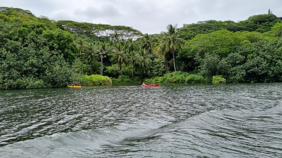 Gegen Mittag fahren wir einkaufen, besorgen uns bei Safeway Mittagessen und fahren dann kurz hinter Lihue. Dort machen wir ein Picknick mit Blick auf den Waimea River. Fische springen ab und zu über das Wasser und Kanufahrer kommen vorbei.