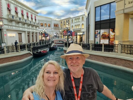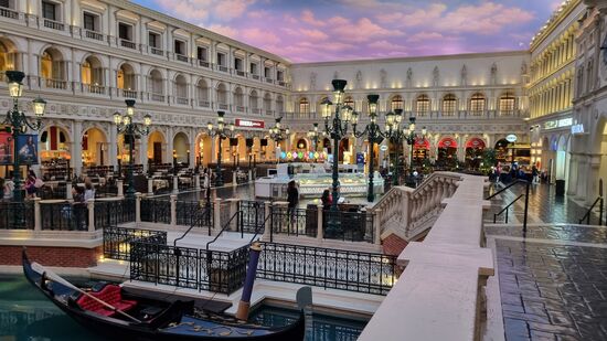 Dort bestaunen wir die Kanäle, die Gondeln und den künstlichen Himmel, der sehr echt aussieht. Die Gondolieri singen.