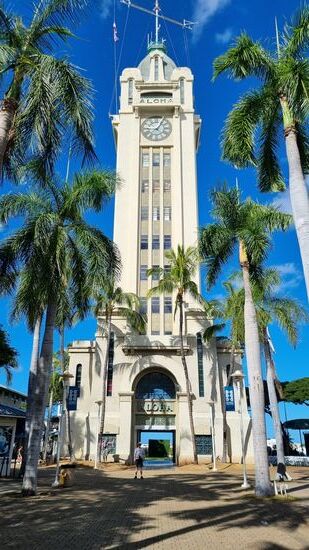 Um 7.30 Uhr gehen wir zum Supermarkt und kaufen Obst sowie Busfahrkarten für 3 Tage (24 $ pro Person). Dann führt uns Google (Gott sei Dank hat Thomas in Deutschland eine amerikanische SIM-Karte für sein altes Handy gekauft!) zur Bushaltestelle und in den Bus nach Downtown. Dort steigen wir aus und laufen zum Aloha Tower, das Wahrzeichen der Stadt, das einen tollen Blick auf die Stadt gewähren soll. Leider ist der Tower wegen Bauarbeiten geschlossen...