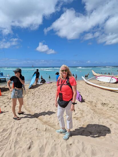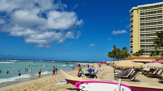 Einige Fotos später nehmen wir den Bus nach Waikiki. Am Outrigger Beach Resort steigen wir aus. Wir finden eine Aneinanderreihung von Hotels, Einkaufscentern und überteuerten Geschäften und sind wenig begeistert. Schließlich finden wir einen Zugang zum Strand und sind wieder enttäuscht. Er ist völlig überlaufen, es ist laut und der Sand gelb, nicht weiss.