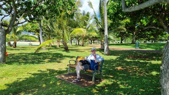 Mit dem Bus fahren wir zurück zum Hotel. Dort wasche ich mit der Hand ein bisschen Wäsche, dann gehen wir zu Fuß in den gegenüberliegenden Ala Moana Beach Park.