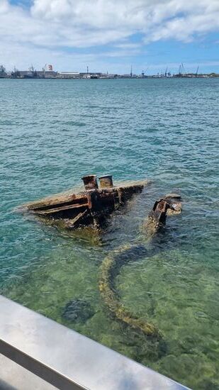Die Überfahrt ist kurz und die Plattform klein. Man sieht 3 rostige Überreste des untergegangenen Bootes im Wasser liegen und eine marmorne Gedenktafel mit den Namen der bei dem japanischen Angriff verstorbenen Soldaten. Das war's dann auch schon.