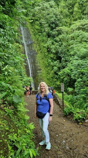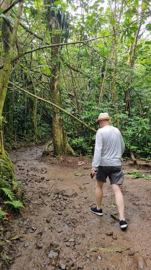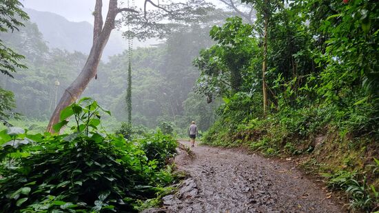 Sobald wir in die Berge kommen, ändert sich das Wetter. 100% Luftfeuchtigkeit. Am Parkplatz zahlen wir 10 $ Parkgebühr und wandern den steilen, felsigen und sehr matschig-rutschigen Trail zu den Manoa Wasserfällen hoch.