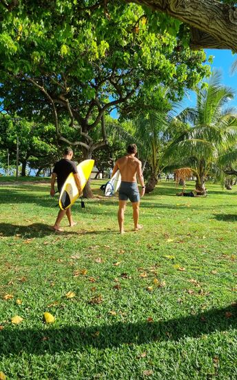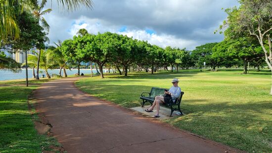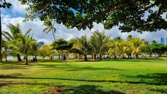 Dann laufen wir zum Maloa Beach Park und genießen die Aussicht. Wasserschildkröten sind heute leider nicht zu sehen, dafür Schmetterlinge und bunte Vögel.