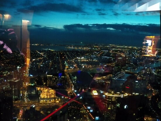 "The Terrace", ein offener Aussenbereich mit Maschendrahtgitter der bei starken Wind geschlossen sein soll, war geöffnet und es wehte mir der Wind um die Ohren. Erstmals war es mir nicht mulmig in dieser Höhe, den Kopf direkt nach unten gerichtet. Es lag sicherlich an der Dunkelheit.