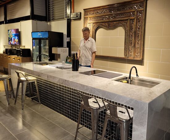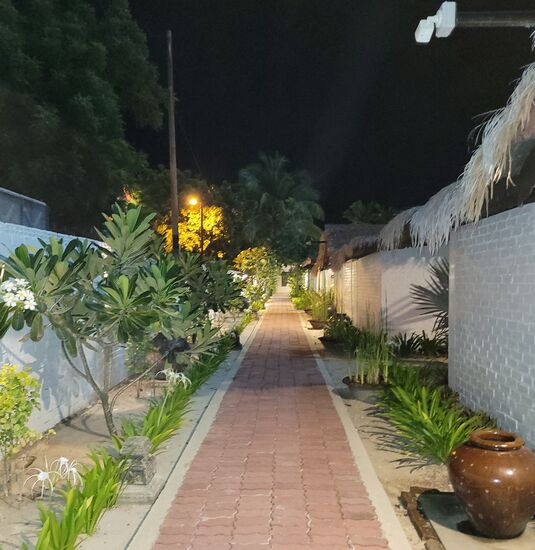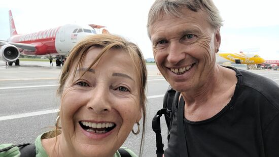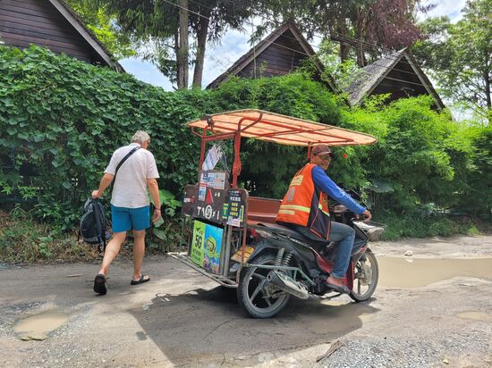 Die Batterie vom Resort Songthaew (Minibus mit Sitzplätze hinten auf der Ladefläche) machte keinen Funken. So wurde für uns ein Taxi gerufen. Das TukTuk war mit unseren 2 großen Trollys und uns beiden, sowie dem Chauffeur den steilen Berg hoch heillos überfordert bzw. überladen. Muskelkraft war angesagt!