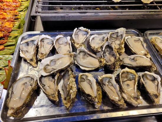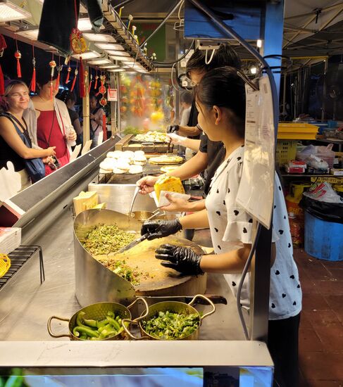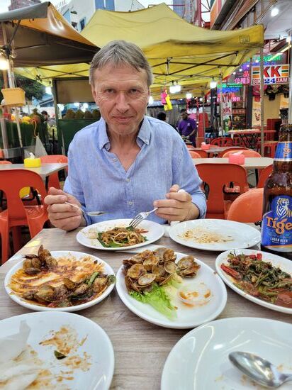 Spät Aufstehen, ausgiebiges Frühstück und ein paar Stunden am Pool liegen, das war unser Plan und den verwirklichten wir. Am späten Nachmittag bummelten wir zum Nachtmarkt. In dieser einen Straße säumen sich rechts und links Essensbuden und Freiluftrestaurants, eine nach den anderen. Bis zum Dunkelwerden fanden sich immer mehr hungrige Menschen ein und bald waren alle Tische besetzt. Viele Teller und Schüsseln mit allerlei Köstlichkeiten wurden aufgetragen und vertilgt. Zum Empfehlen - das Essen schmeckte gut und die Preise reißen kein Loch in das Reisebudget.