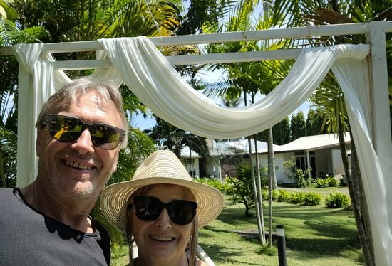 Das nächste Resort ist ca. einen Kilometer entfernt und dazwischen gibt's nicht außer einem Local-Restaurant. Bei diesem kehrten wir auf ein Cola (Evi) und einen Kalamansi-Juice mit in Salz eingelegten Sch...Pfleimlen (Manni) und wurden sofort von einheimischen Gästen in ein nettes Gespräch verwickelt.