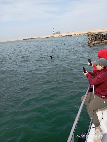 Man wird vom Hotel abgeholt, per Shuttle nach Walfishbay gefahren und dort besteigt man einen Motor-Katamaran, heute mit etwa 20 Leuten.