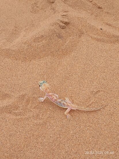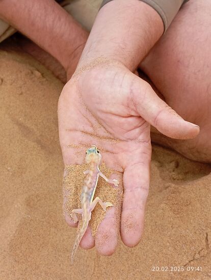 ein durchsichtiger kleiner Salamander, der wie versteinert in seiner Hand steht. Alle können rundum Fotos machen, er bewegt sich nicht einen Millimeter. Auch als er ihn in den flachen Sand stellt, bleibt er wie ein Denkmal stehen.