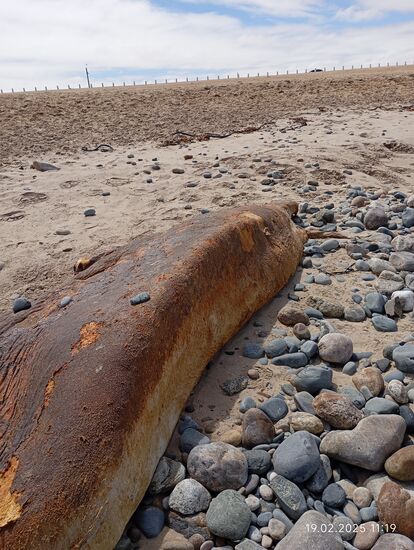 Kein lebendes Wesen, aber deutlich größer: ein angeschwemmter toter Wal, der hier schon 14 Tage liegen soll.