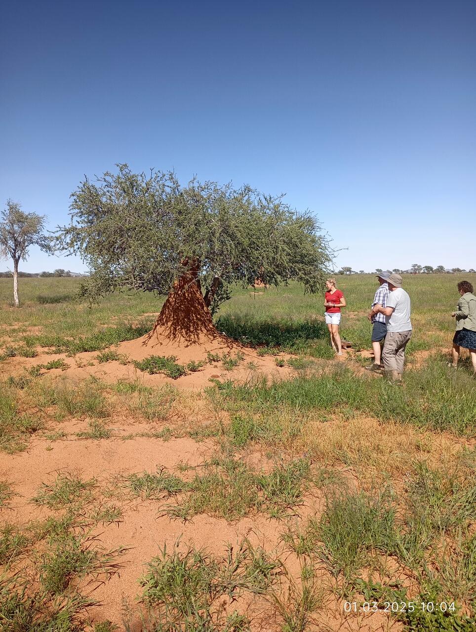 Nach so bviel täglicher Routinearbeit hat Andreas und Gattin sofort die Gäste zu einer Rundfahrt durch das gesamte Farmgelände eingeladen, Start um 9.45 Uhr! Mit dem Besucher-Toyota mit erhöhter Platform starten wir über Feldwege im Schritttempo durch die Steppe. Hinten sehen wir einen Schwarm Schwarzstörche hochsteigen, hinter einer Baumgruppe starten zwei Raubvögel in Adlergröße - nein das seien Aasgeier-,kurzer Halt an einem Busch, da unten die Schildkröte könnte uns vor die Reifen laufen ! Dann Halt zum Aussteigen an einem Termitenhügel, aus dem ein Baum herausragt: