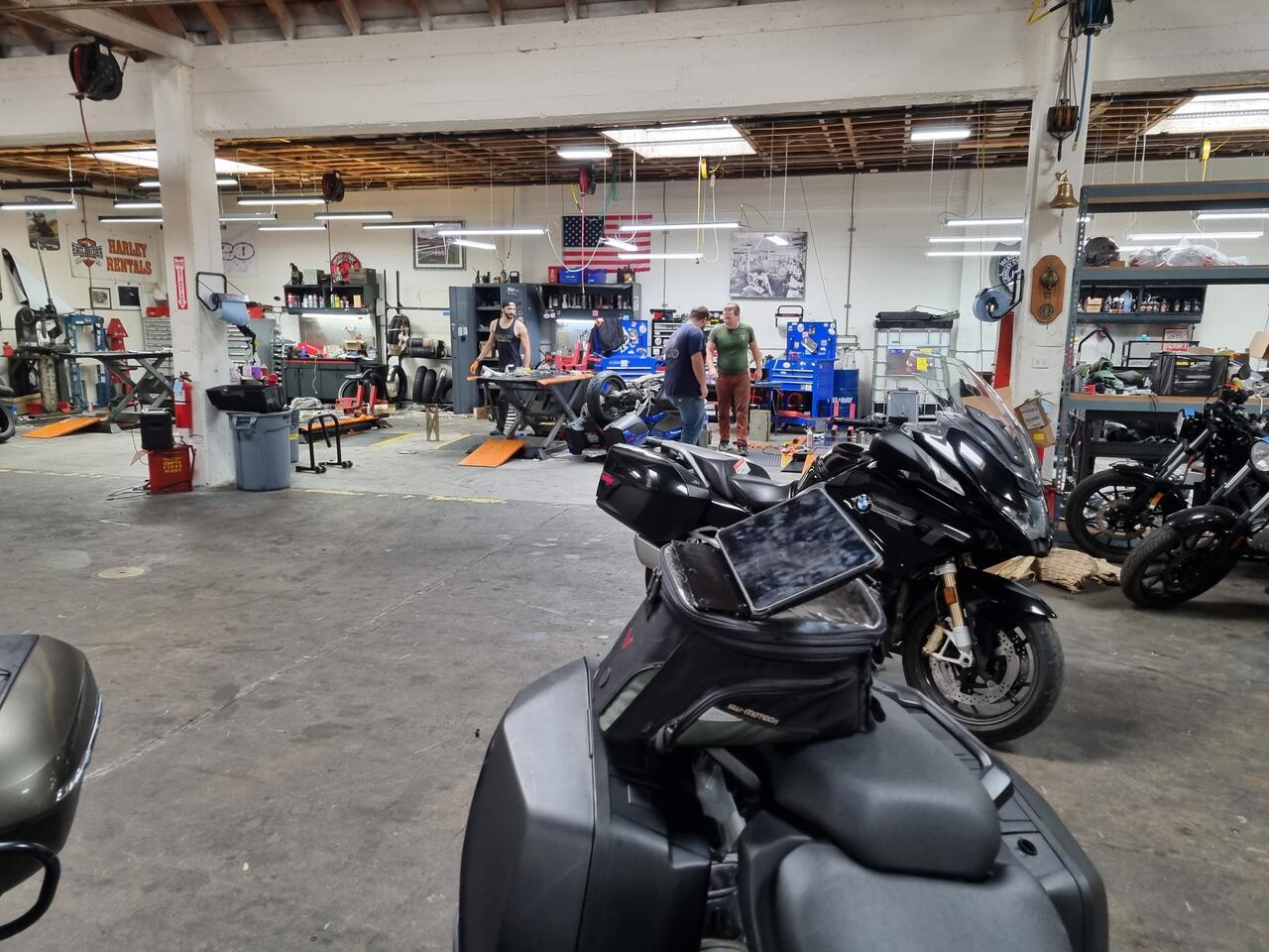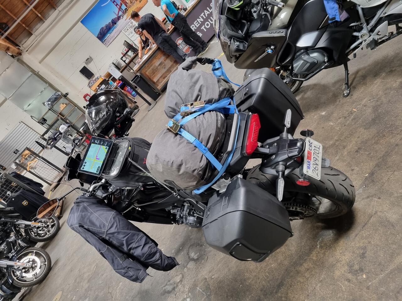 Im Hintergrund sieht man eine von der Hebebühne gefallene R1250RT, eigentlich für uns als Ersatz vorgesehen, dann aber natürlich KAPUTT. Weiter vorne steht eine der drei R1250RT`s die die anderen drei dann fahren mussten, ich bekam eine YAMAHA Tracer, auch nicht gut mit viel zu kleinem Tank.