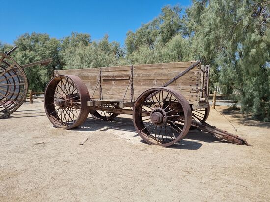 Auf die Harmony Borax Worx Wagen, zum Transportieren von geschürftem Borax mit 20 Mulis vor den Wagen. Der letzte Wagen ist der Wasserwagen für die Mulis (und die Kutscher).