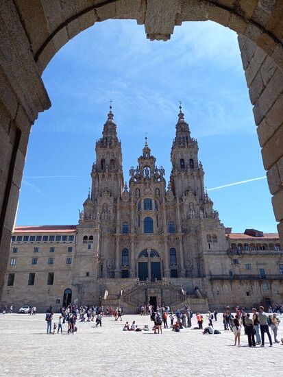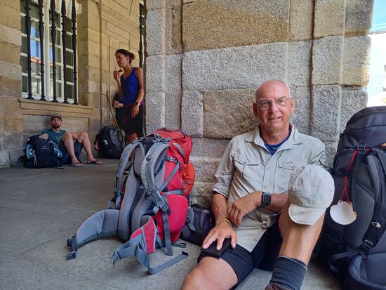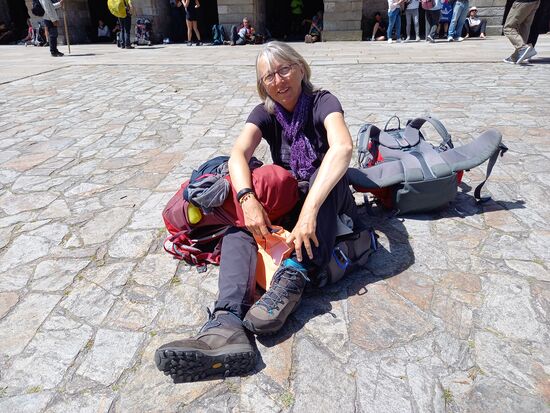 Es ist ein hochemotionaler Moment nach einem so langen Weg, voll Anstrengung und Glücksmomenten anzukommen. Mir liefen die Tränen und ich bin glücklich! Auch Matthias geht der Moment nah. Wir liegen uns im Arm. Versuchen in wenigen Fotos das Erlebnis festzuhalten und gleichzeitig einfach nur das Gefühl in diesem Moment zu leben. Rucksäcke von den Schultern, hinsetzen, inne halten. Um uns herum sind andere Pilger. Jeder mit anderen Gefühlen. Viele haben total kaputte Füße oder Knie. Ich bin dankbar, denn wir sind zusammen und gesund angekommen. Außer zwei Blasen am Fuß und müden Knochen, keine Blessuren.