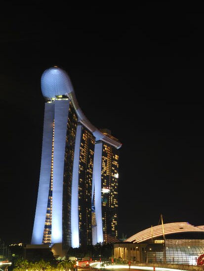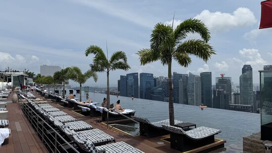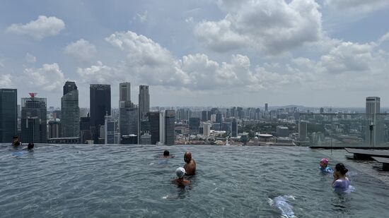 Per Grab fahren wir zu unserem Hotel—dem „Marina Bay Sands“ -da wir noch nicht einchecken können, schauen wir aber schonmal nach óben zum Pool