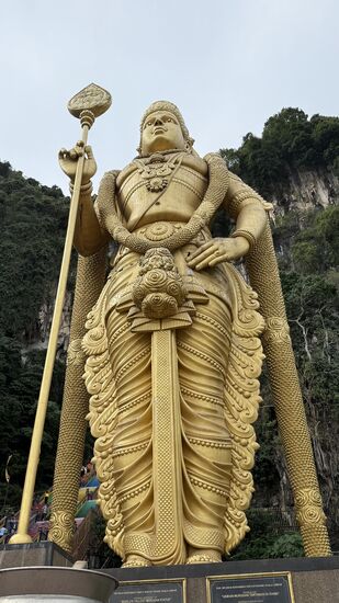 Vor den Höhlen befindet sich die 40m hohe Statue des Gotte Murugan—272 Stufen führen zur Haupthöhle hinauf