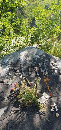 Erst jetzt registriert meine Seele, dass ich ein geliebtes Wesen verloren habe, und ich wache todtraurig auf. Auf dem Weg zum historischen Steinbruch sammle ich Blumen und Steine, womit ich eine Gedenkstätte schmücke. Dabei bitte ich Slava um Verzeihung – dass ich ihn womöglich nicht richtig medikamentiert und nicht bei ihm geblieben bin.