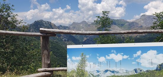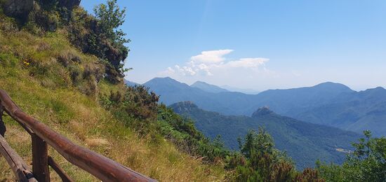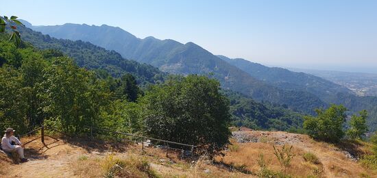 Von unseren Bekannten haben wir einen Tipp bekommen: Den Passo Croce. Er soll einen spektakulären Ausblick bieten. Wir erhoffen uns kühlere Bergluft und werden nicht enttäuscht; es hat „nur“ 33 Grad. Dorthin fahren wir Richtung Arni (links; rechts wäre Stazzema) über den Ort Terrinca hinaus und haben gleich zwei mega-Ausblicke: Auf die bis zu 1.800 Meter hohen Gipfel ins Landesinnere und die Küste Richtung Meer. An klaren Tagen könne man u. a. Korsika sehen, doch dazu ist es heute zu diesig.