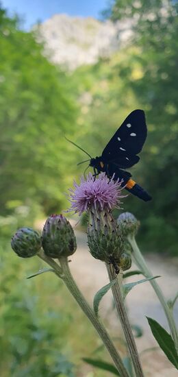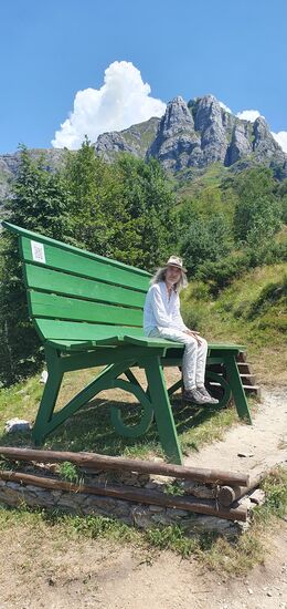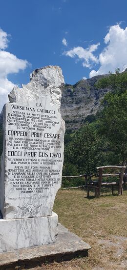 Die Grüne Bank blickt auf die Grenzlinie zwischen den Truppen der Achsen- und der Alliiertenmächte (1944/45); der Pass hat seinen Namen von einem Marmorkreuz, das zum Andenken zweier junger in den Bergen umgekommener Leute im 18. Jahrhundert errichtet wurde. Überall an den Wegen findet man die so genannten „Marginetti“ – kleine Schutzhäuschen, die gleichzeitig der Heiligenverehrung dienen. Heute lassen sich die Naturgewalten nur noch erahnen – zu glatt angelegt sind die Wege, auf denen man laufen kann. Sie sind entweder asphaltiert oder von Marmorgeröll bedeckt und gut gangbar. Ranger fahren vorbei und fragen mich, ob alles in Ordnung sei, da ich für meine Insektenfotografie bedrohlich nahe am Abgrund hänge.