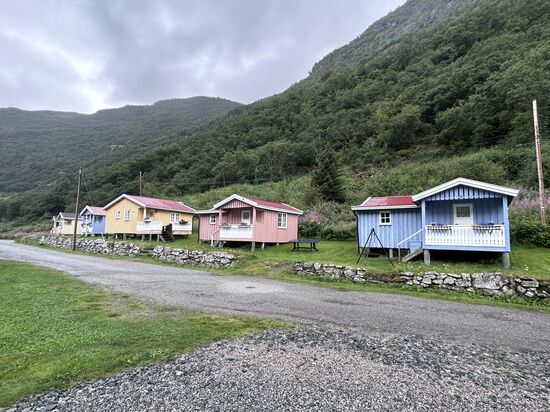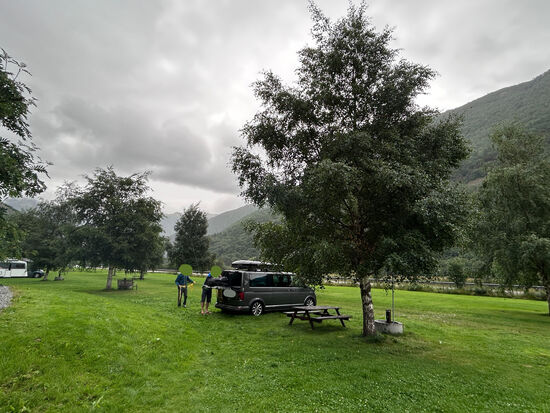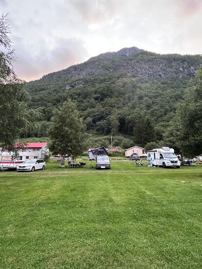 Nach einem langen Reisetag erreichten wir am Abend unseren ersten Übernachtungsplatz in Norwegen. Der Campingplatz, schlicht, aber zweckmäßig, liegt wunderschön eingebettet zwischen Hügeln.