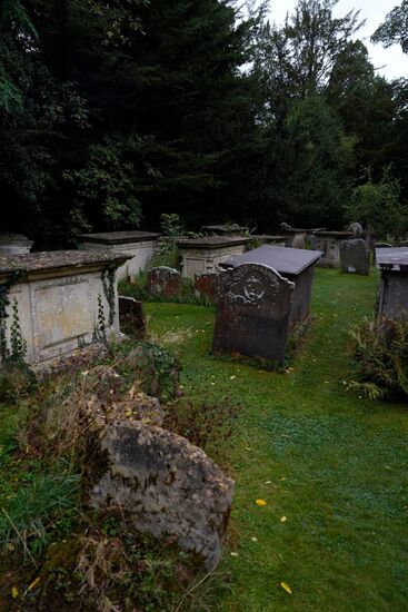 Der atmosphärische alte Friedhof bei der Kirche mit einem alten Grabstein mit einer aufwendigen Verzierung in Form eines Kleeblatts