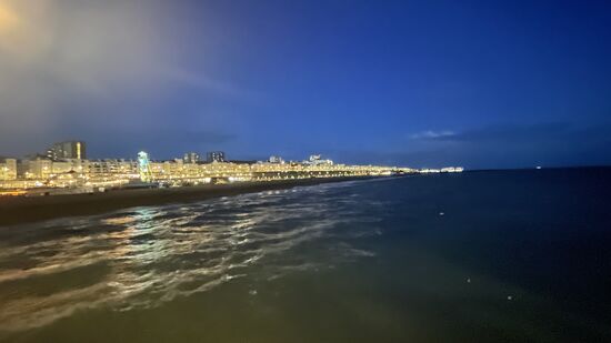 Nach einer Stärkung ist es schon dunkel und so sieht das „Palace Pier“ beleuchtet aus -es ist ein Vergnügungspier mit Spielhallen, Fahrgeschäften, Arkaden, Restaurants und viele Imbissbuden.