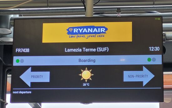Mit 10 Minuten Verspätung schwang sich der Ryanair-Vogel mit uns an Board bei 9°C in die Luft und bei 28° stiegen wir in Lamezia aus dem Flieger.