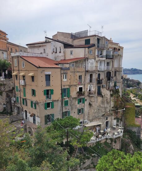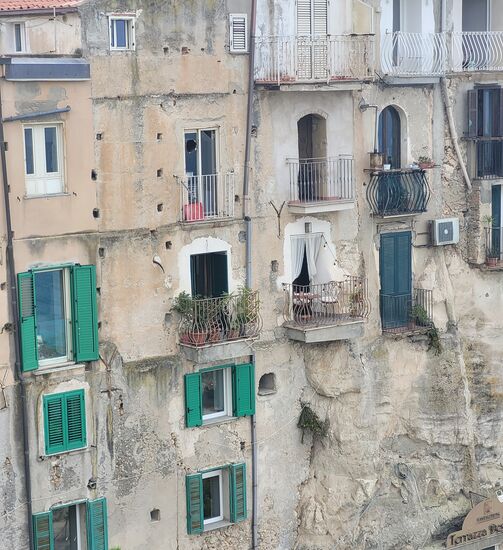 Auffallend an den alten Häusern von Tropea sind die quadratischen Löcher in den Außenmauern. Die Häuser wurden früher ebenerdig oder zweistöckig gebaut. Wurde das Gebäude aufgestockt, schob man Holzbalken in diese Löcher hinein, auf denen man Gerüstbretter verteilte, um die Arbeiten am Haus nach oben hin fortzusetzen.