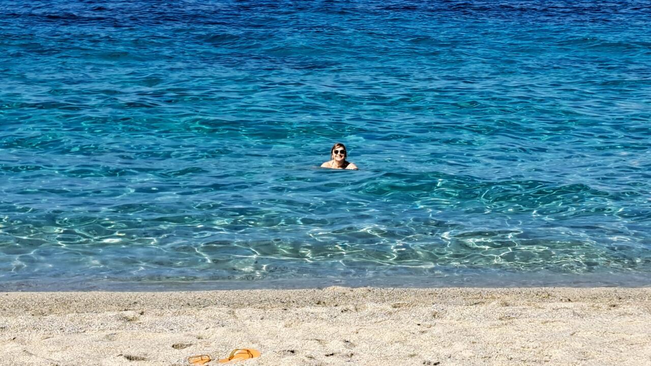 Blauer Himmel und ruhiges Meer verlangte nach einem Liegestuhl am Strand. Wir ließen uns bis zum Nachmittag die Sonne auf den Bauch scheinen. Das Meer hatte eine angenehme Temperatur zum Schwimmen (für mich - ihm war es zu frisch!!!! lt. Internet 23°)