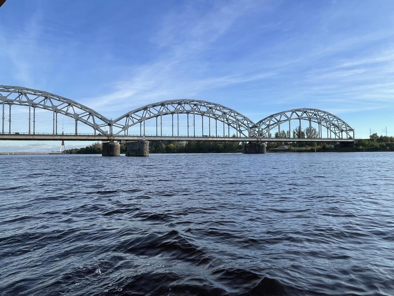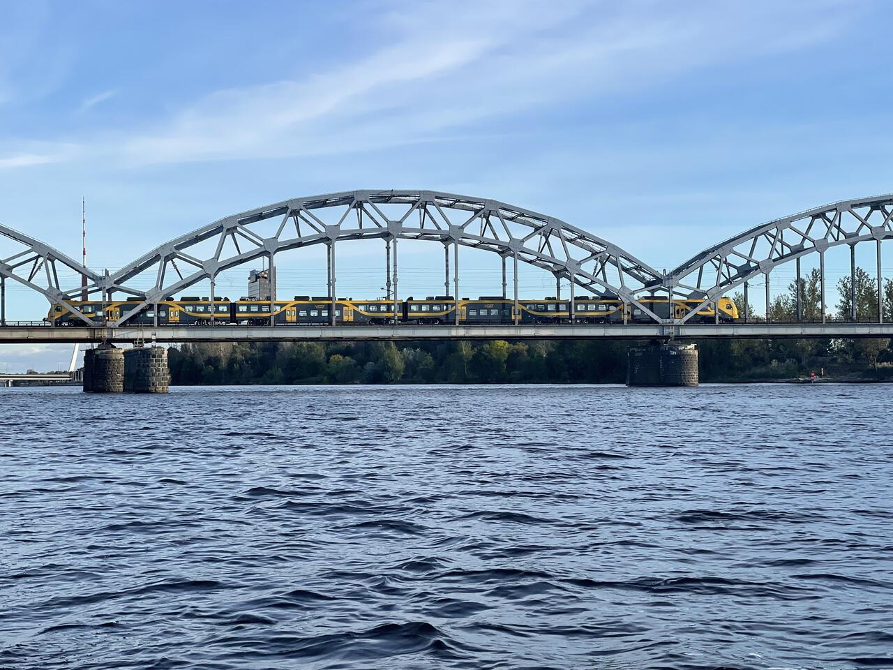 Hier sieht man den Bau der neuen Rail Baltica Eisenbahnbrücke, parallel zur bestehenden Eisenbahnbrücke