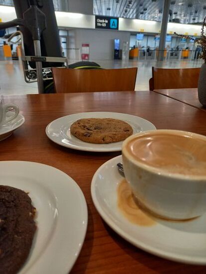Ich habe recht gut geschlafen und bin inzwischen die Ruhe selbst Zurück am Flughafen beobachte ich das Treiben um mich herum und genieße dabei einen Kaffee und Croissant. Ich habe noch viel Zeit bis zum Boarding.