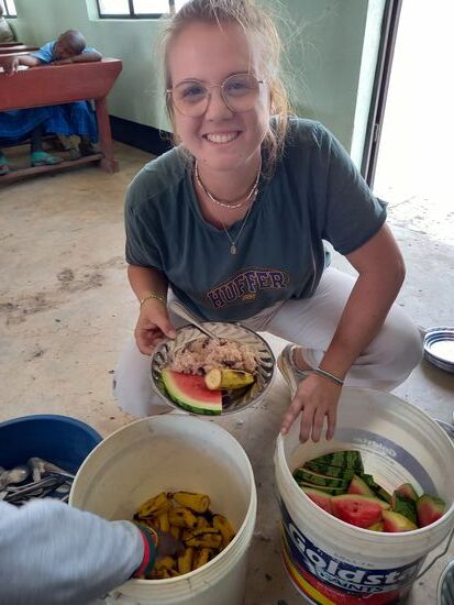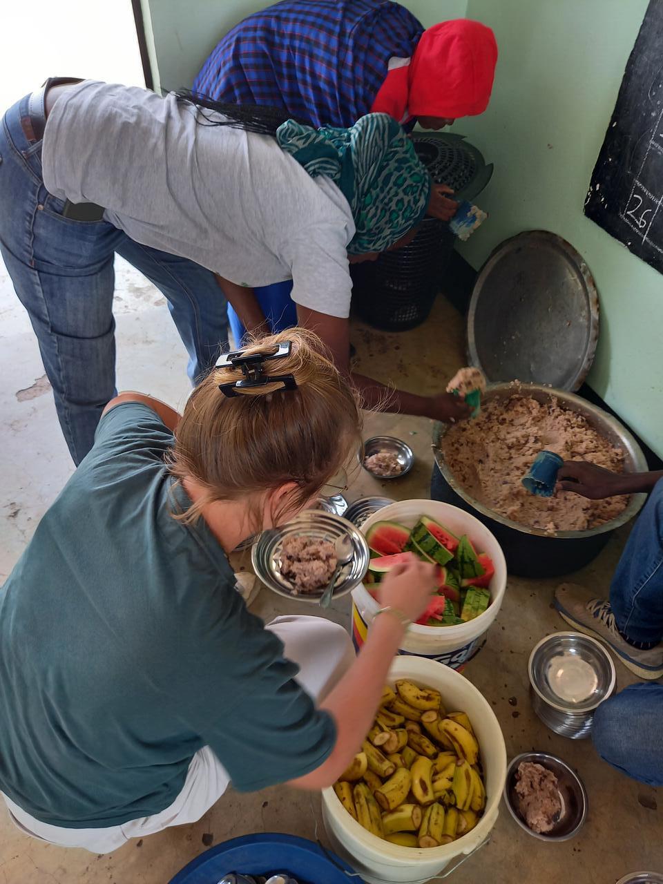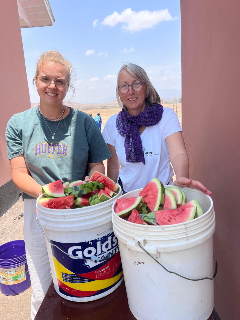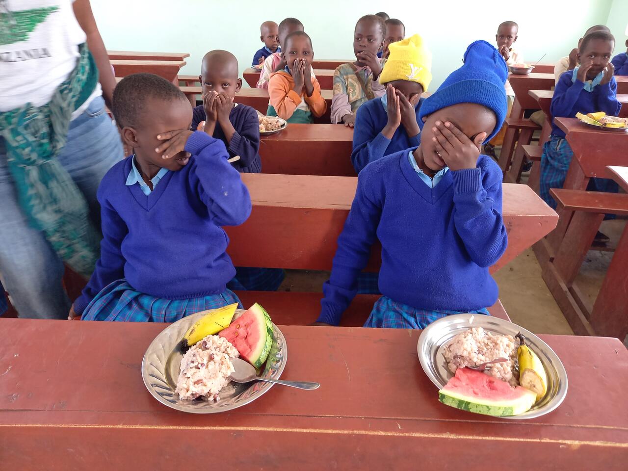 Wir haben Melonen und Bananen mitgebracht. Obst steht nur sehr selten auf dem Speiseplan. Immer nur dann, wenn Besucher wie wir welches mitbringen. Ansonsten gibt es Reis, Bohnen oder Porridge. Aber auch ohne Obst bedeutet es für die Kinder viel. Denn oft ist es für sie die einzige Mahlzeit am Tag.