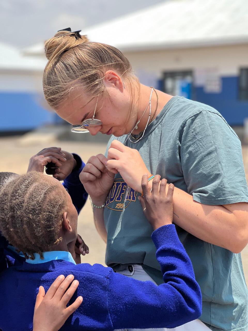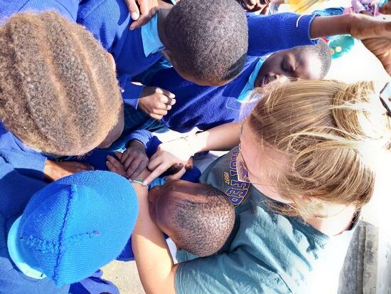 Die Kinder sind unglaublich offen, interessiert und neugierig. Sie untersuchen das Tattoo von Angela und prüfen ob man es abwischen kann.