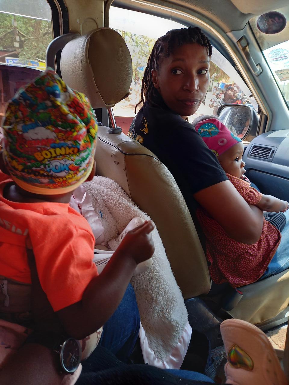 Vorn sitzt Rose mit zwei Kleinen auf dem Schoß. Anschnallpflicht und Kindersitze ....