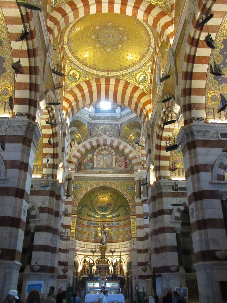 Die Kirche "Notre-Dame de la Garde" ist nicht besonders gross, dafür hat sie eine prächtige Innenausstattung. mit Ornamenten und Mosaiken. Der goldene Hintergrund, vor dem sich viele Gemälde und Statuen befinden, ist an den byzantinischen oder oströmischen Stil angelehnt.
